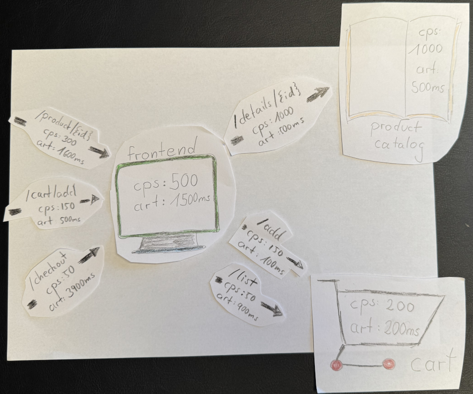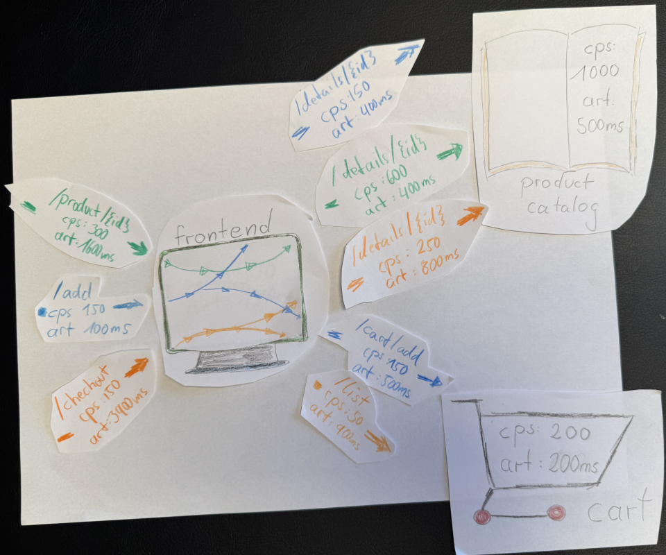 For image 3 we add context propagation, tracking how requests flow across services, the picture sharpens. Now we can see: The slow checkout (3.9 s) calls the details endpoint on the product catalog, where ART jumps from 400 ms to 800 ms. Checkout apparently makes five details calls per transaction (CPS jumps from 50 to 250).